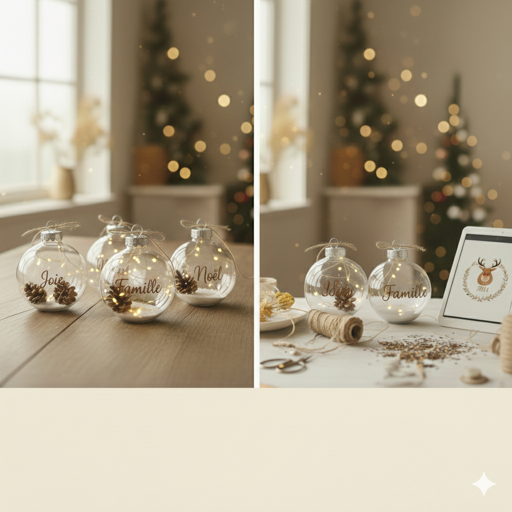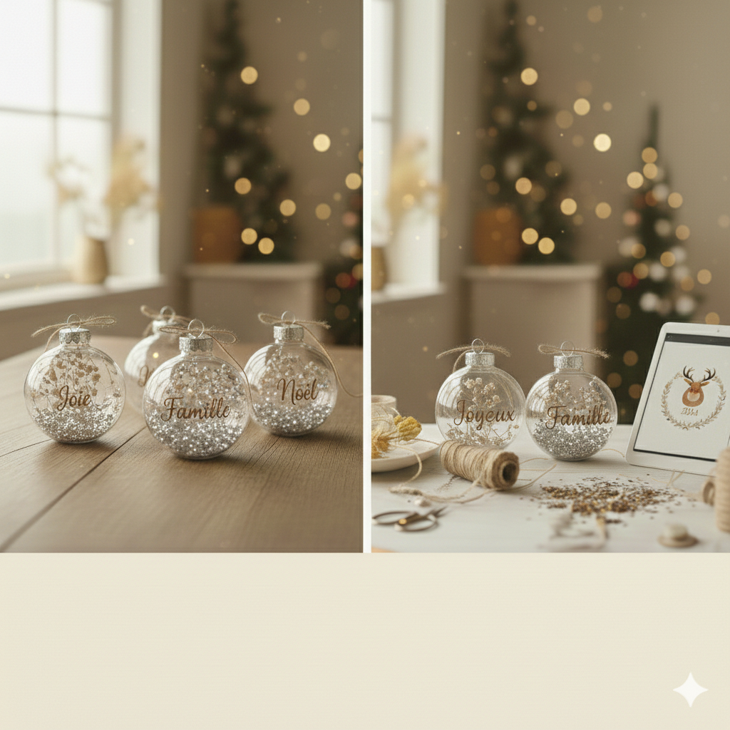 Ces décorations raffinées se déclinent en différents formats : boules transparentes, parfaites pour un sapin traditionnel, un style scandinave ou une décoration de table festive.